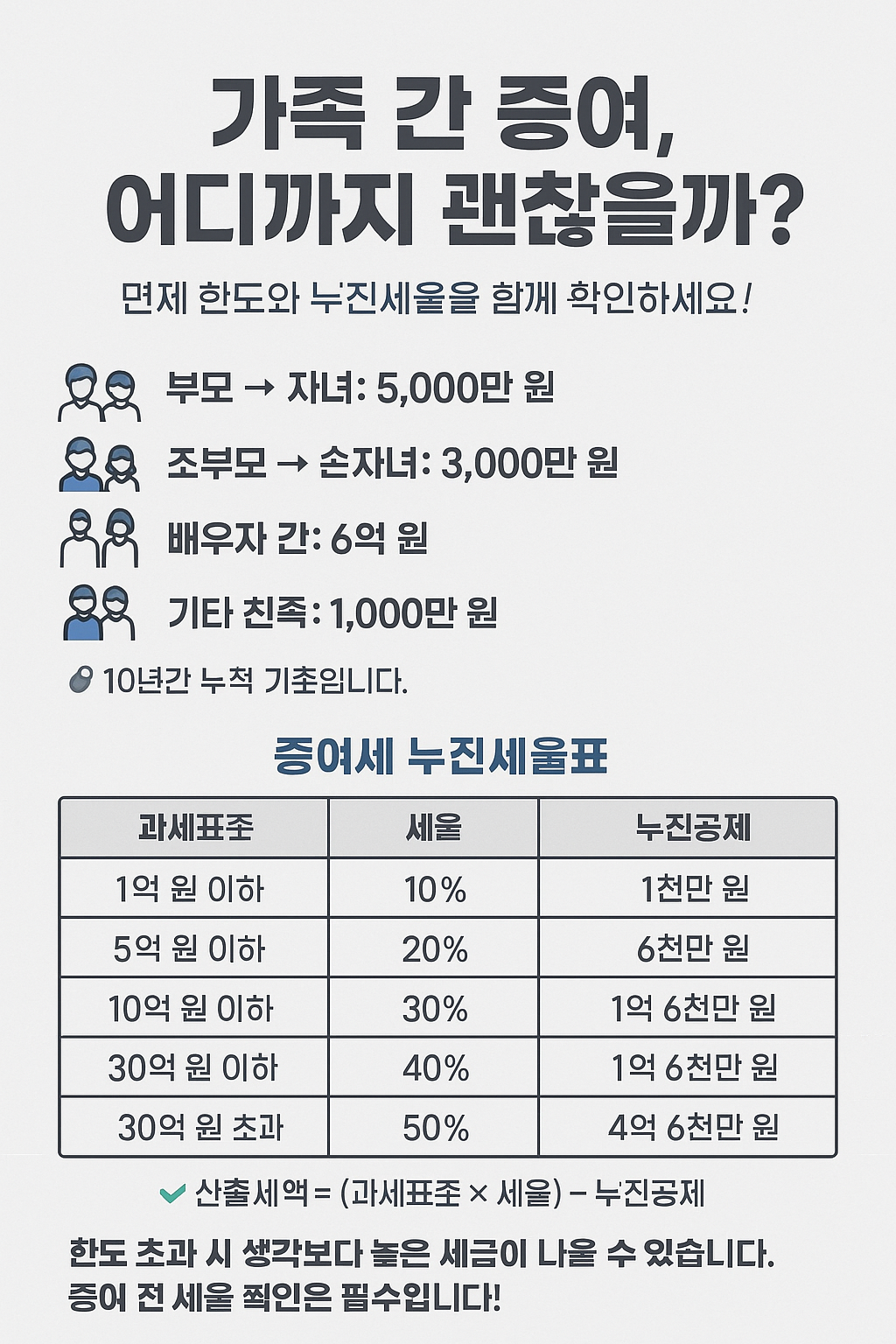 가족 간 증여는 관계에 따라 면제 금액이 다르며, 10년간 누적 금액 기준으로 적용됩니다.
