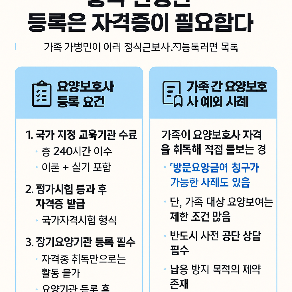 가족 간병인이 아니라 정식 간병인 또는 방문요양 인력으로 등록하려면 반드시 요양보호사 자격증이 필요합니다.