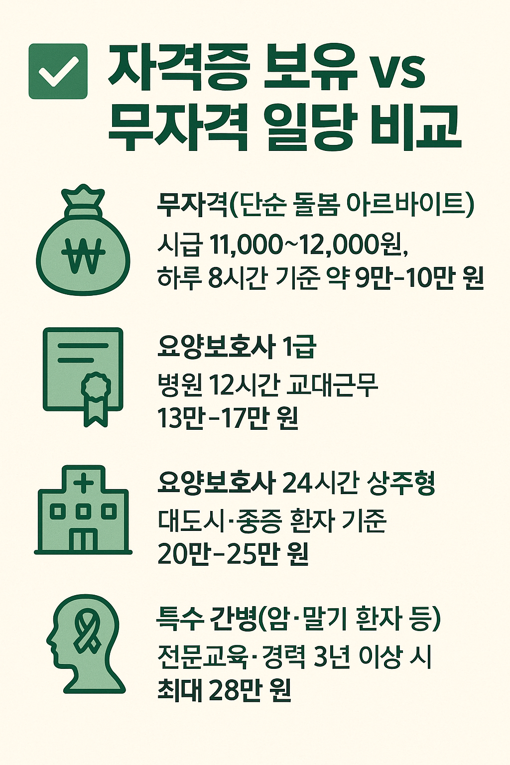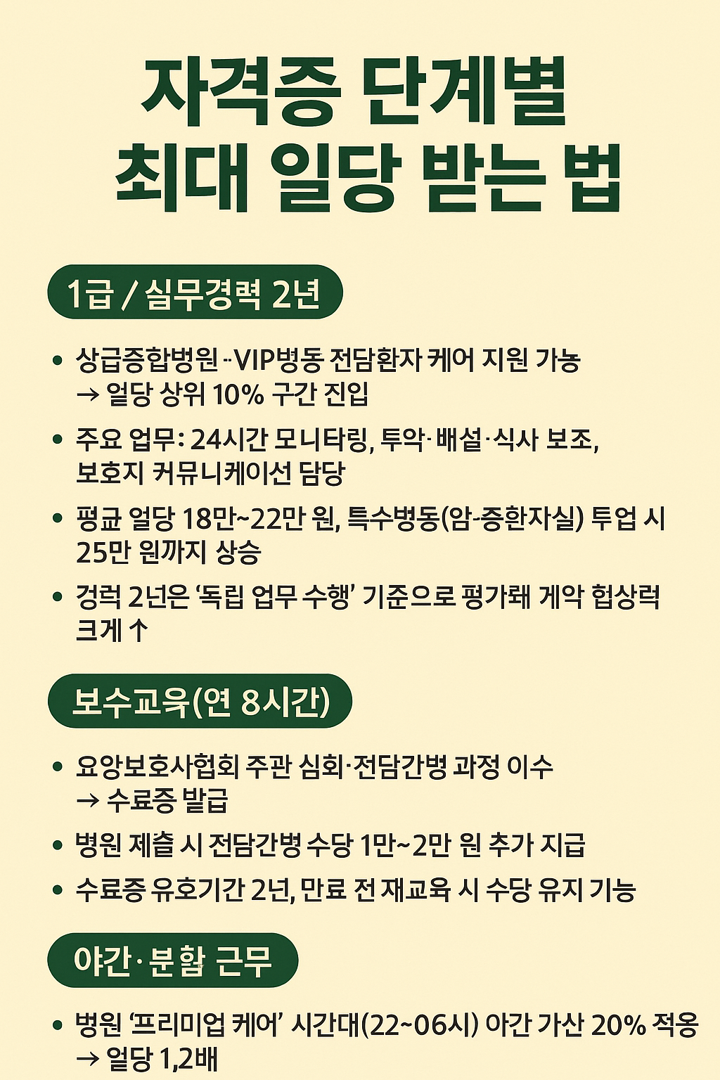 - 상급종합병원·VIP병동 전담환자 케어 지원 가능 → 일당 상위 10% 구간 진입