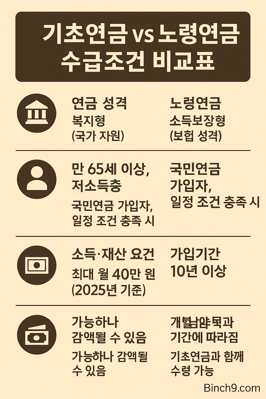 | 수급 대상 | 만 65세 이상, 저소득층 | 국민연금 가입자, 일정 조건 충족 시 |