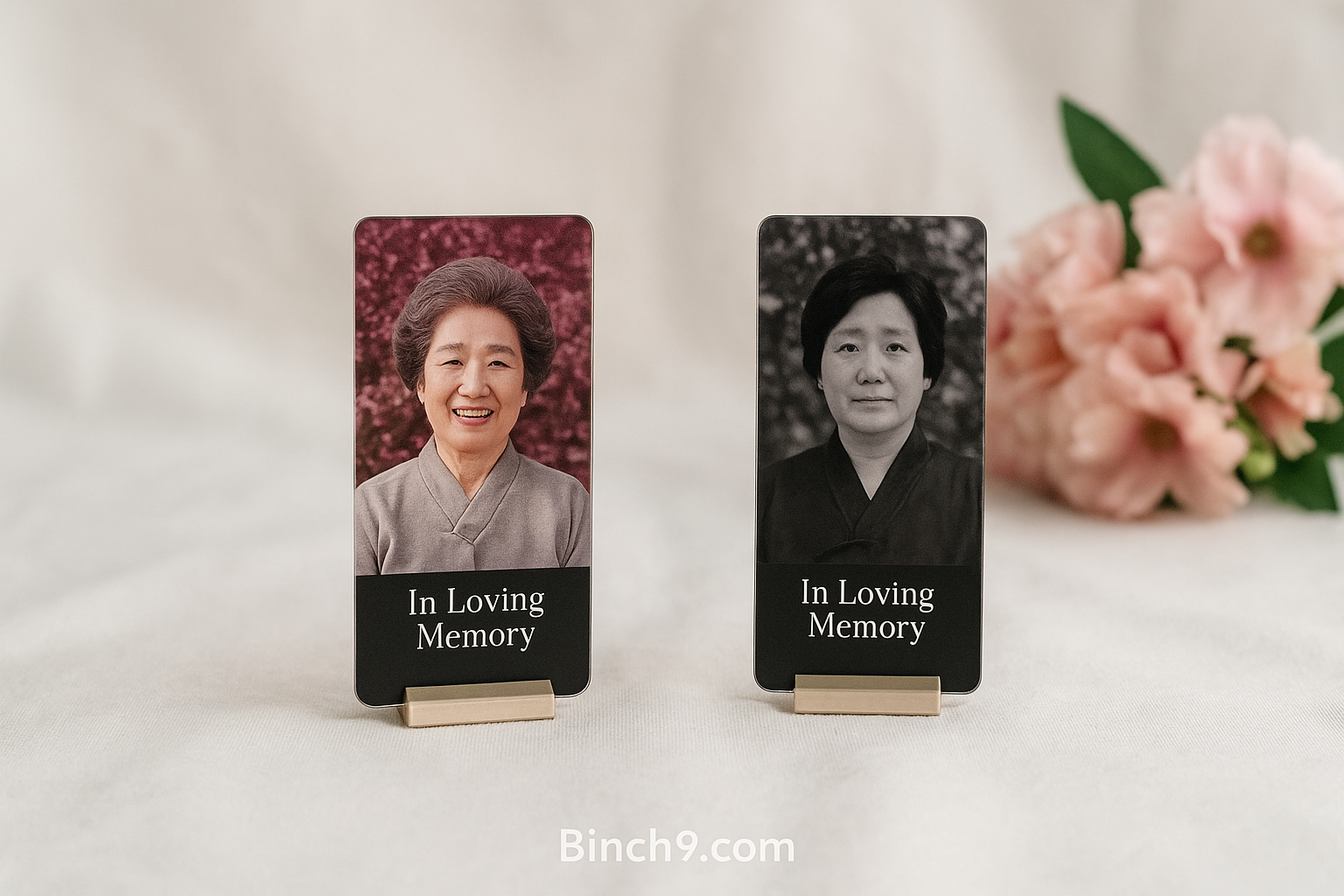 정씨 가족은 외조모를 사설 봉안당에 모시면서, 고인의 사진 + 성함 + ‘사랑하는 어머니, 평안히’라는 문구가 들어간 맞춤형 아크릴 명패를 제작해 부착했어요. 명패 아래에는 손편지와 조화도 함께 놓아, 하나의 미니 제단처럼 따뜻한 공간이 되었어요.