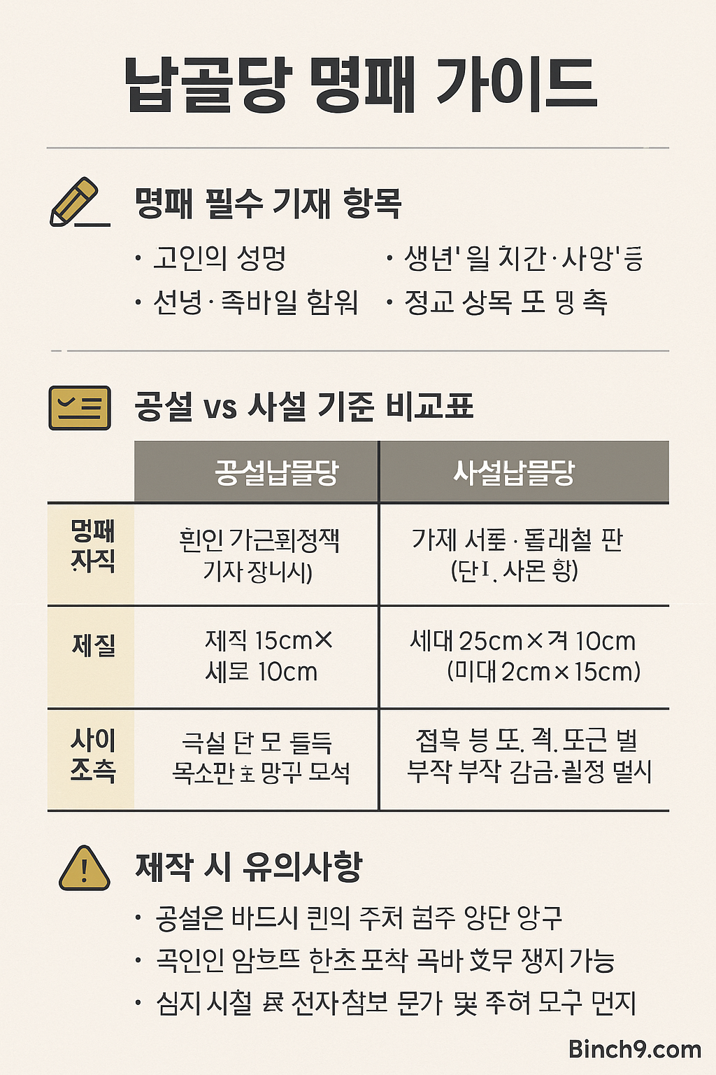 인포그래픽 제안 : ‘납골당 명패 가이드’ – 공설 vs 사설 명패 차이 + 문구 구성 예시 + 부착 위치 안내도