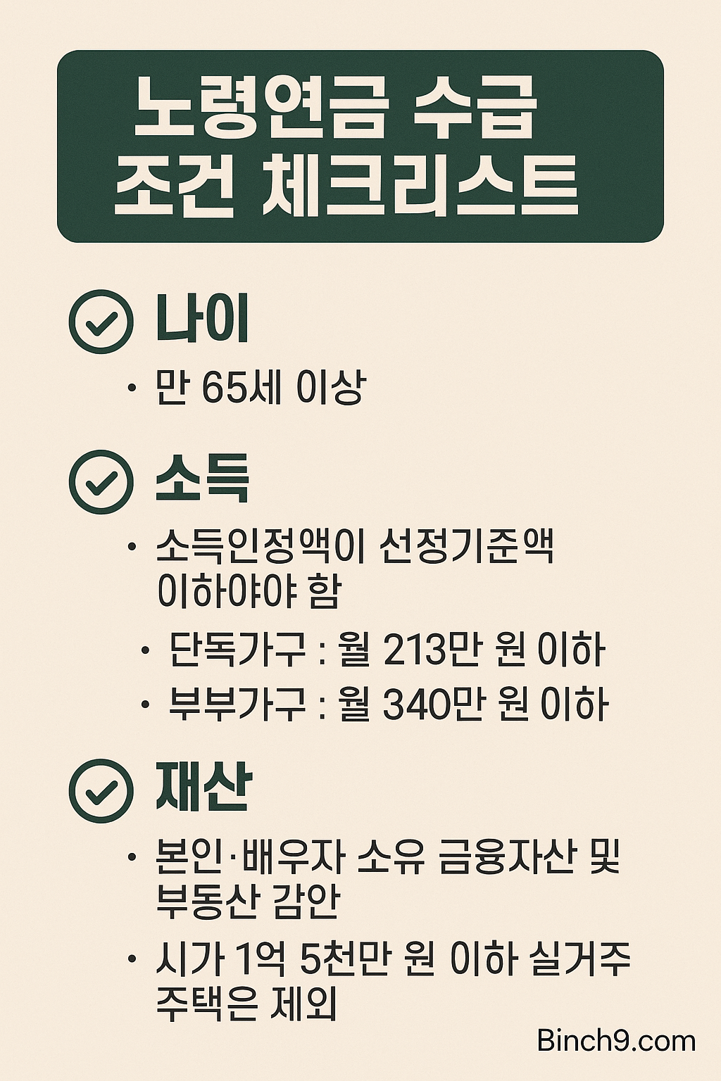 - 나이 기준: 만 65세 이상인 대한민국 국민이어야 합니다. 주민등록상 생일 기준으로 만 65세가 되는 달부터 신청 가능하며, 소급 지급은 되지 않기 때문에 해당 월에 반드시 신청해야 손해를 보지 않습니다.