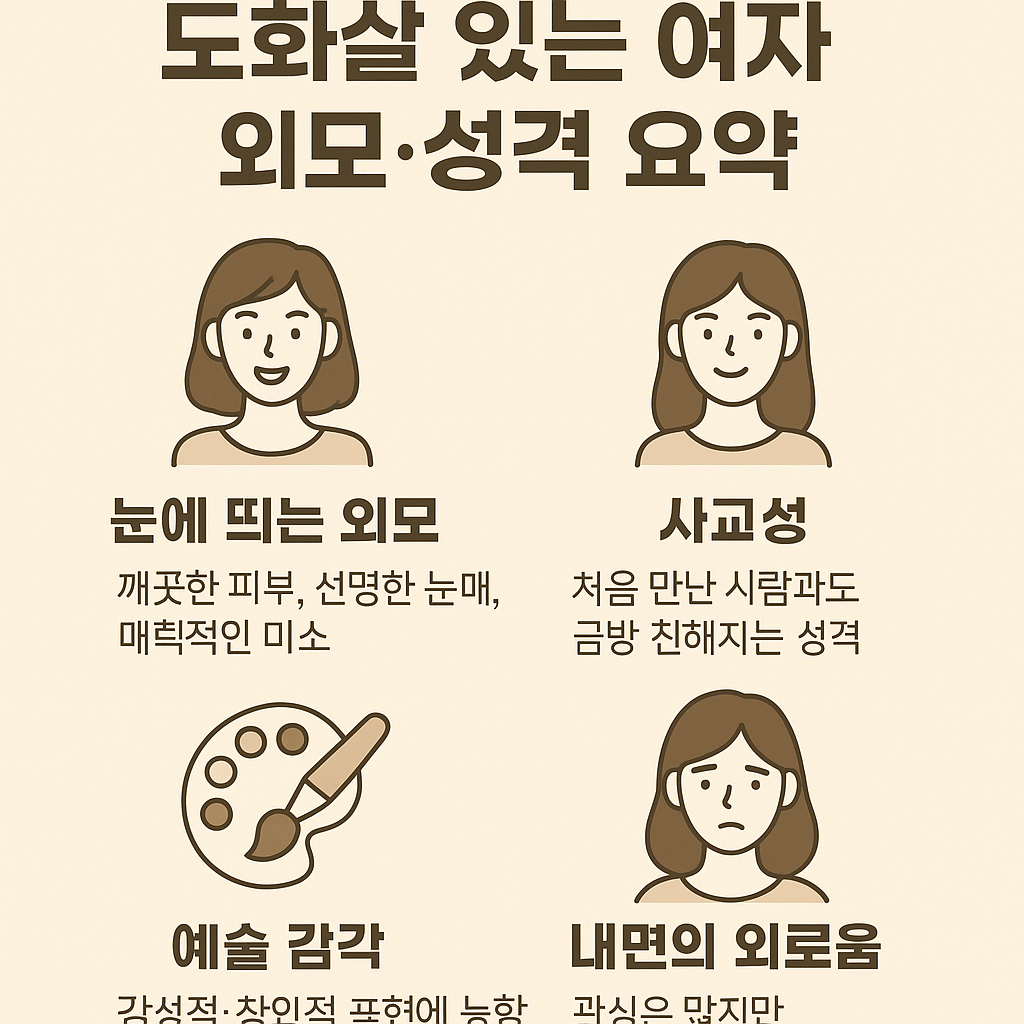 이 글에서는 도화살이 있는 여자의 외모적 특징부터 성격, 감정선, 그리고 사회적 관계에서 나타나는 장단점까지 종합적으로 다뤄볼게요!