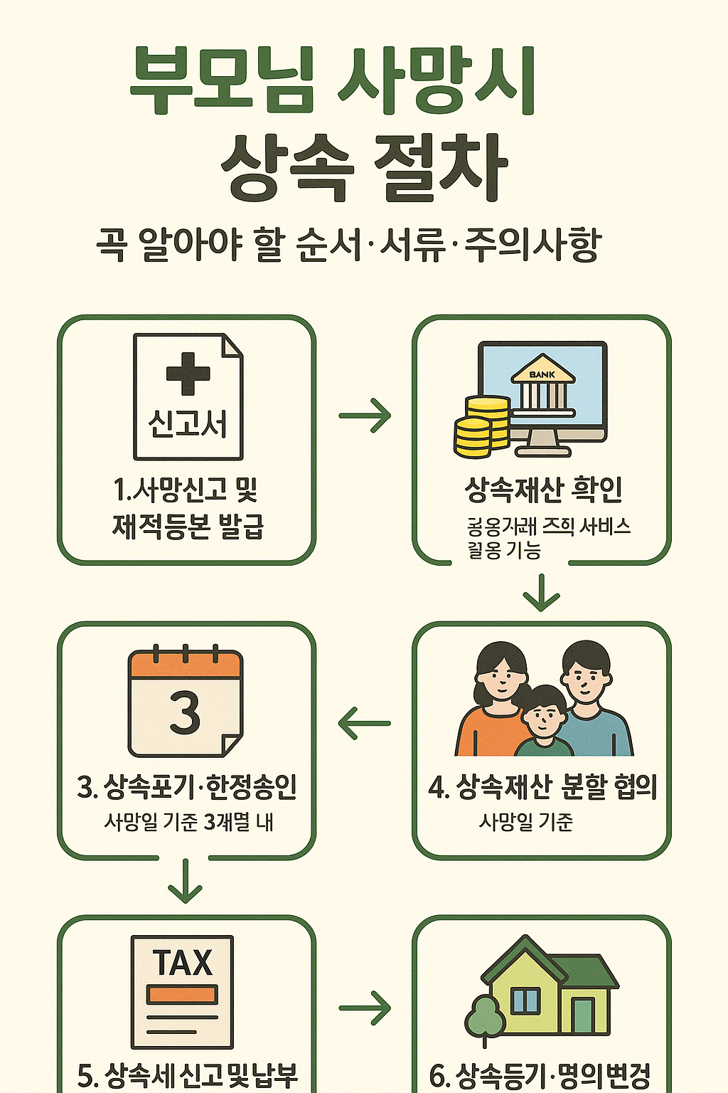 부모님 사망시 상속 절차는 사망신고 → 재산 확인 → 상속포기·한정승인 여부 결정 → 재산 분할 협의 → 상속세 신고·납부 → 등기·명의변경 순으로 진행됩니다.