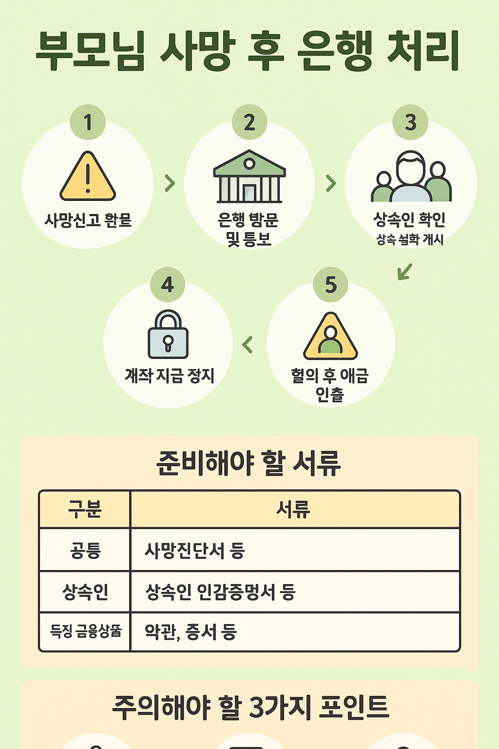 중요: 가족 중 누구라도 은행에 사망 사실 통보하면 계좌는 즉시 지급 정지됩니다. 이후는 상속인 전원 동의 절차가 필요하니 미리 협의가 필수에요.