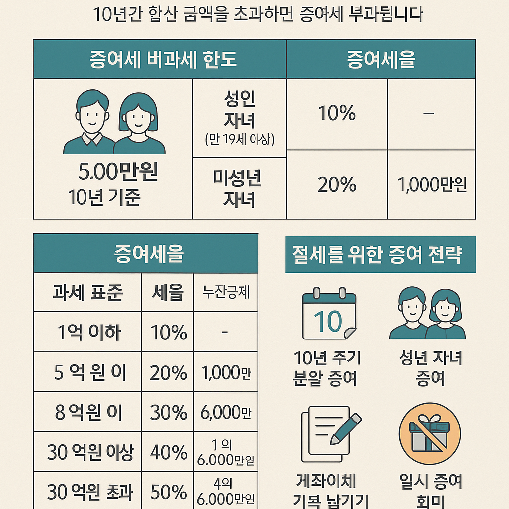 연령별 증여한도표, 증여세율표, 절세 전략을 인포그래픽으로 구성하면 매우 유용해요.