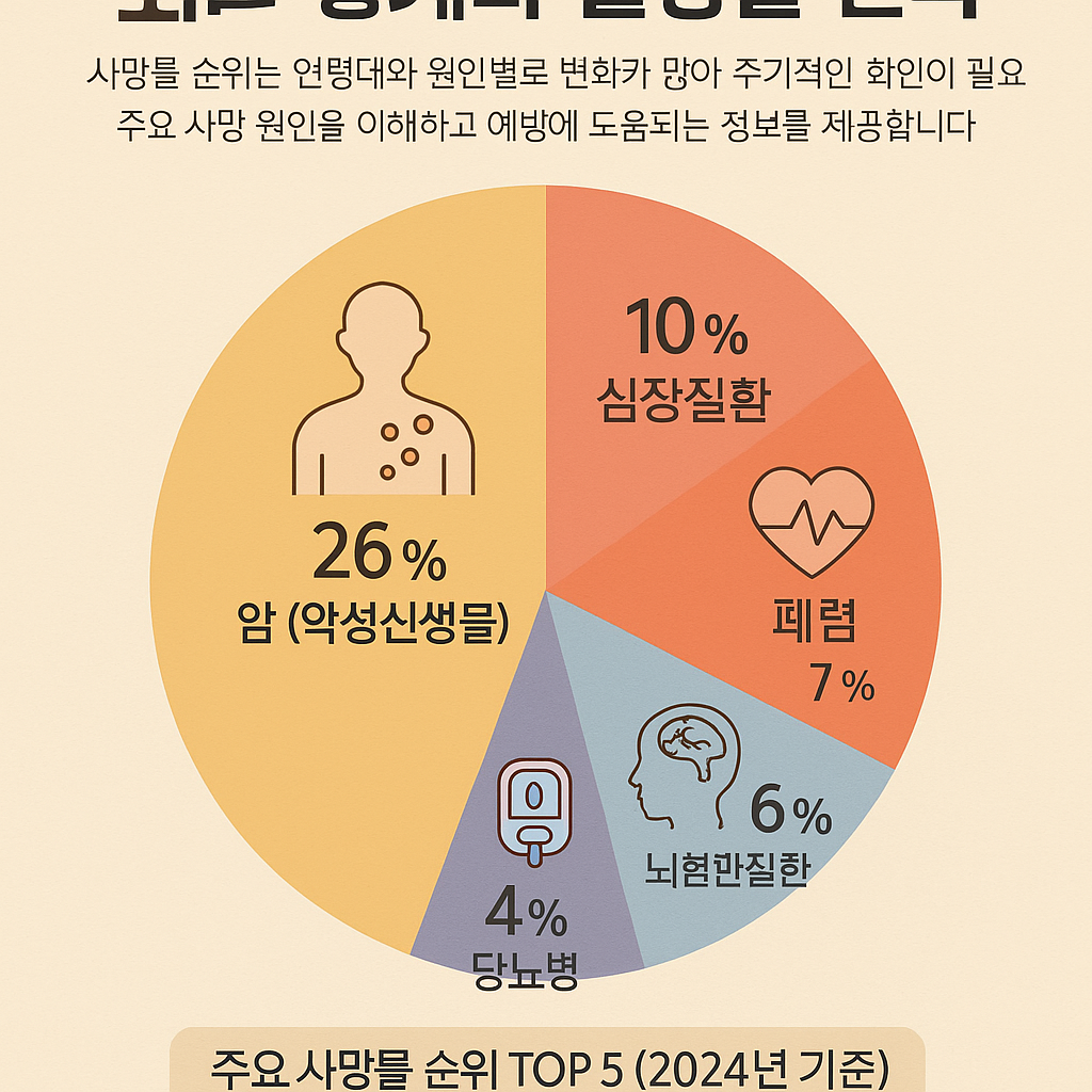 사망률 순위는 암, 심장질환, 폐렴, 뇌혈관질환 등이 상위를 차지하며, **정확한 정보 확인과 예방 관리가 중요합니다.** 통계청 자료를 주기적으로 참고하세요.