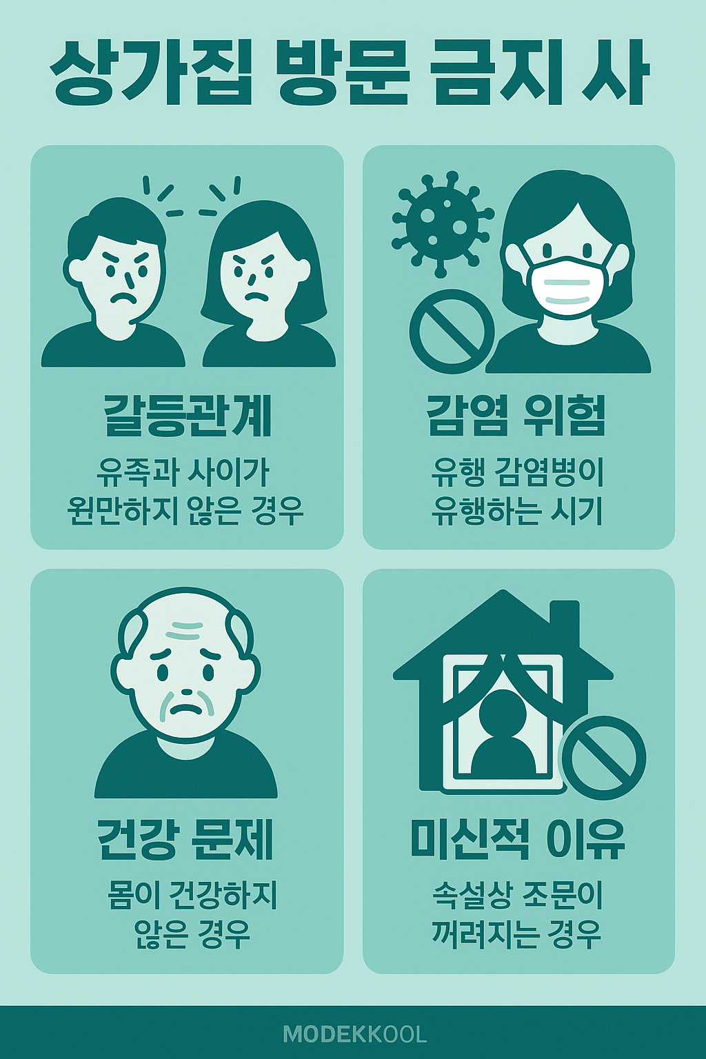 다음과 같은 경우에는 상가집 방문이 오히려 유족에게 불쾌감이나 상처를 줄 수 있습니다. 단순히 관념이 아니라, 그 이유와 맥락까지 이해해야 합니다.