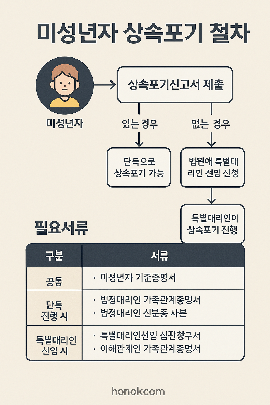 가정법원에 ‘특별대리인 선임 신청 → 허가 → 포기신청’ 순으로 진행해야 하며, 절차가 누락되면 신청이 기각될 수 있다.