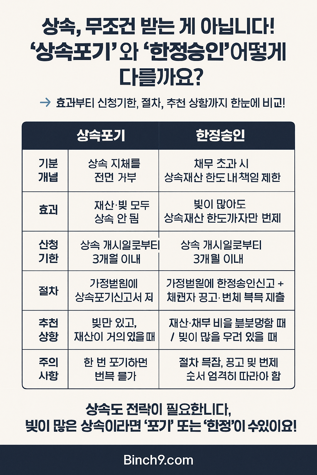 인포그래픽 제안 : ‘상속포기 vs 한정승인 비교표’ – 효과, 신청기한, 추천 상황, 절차 요약 정리