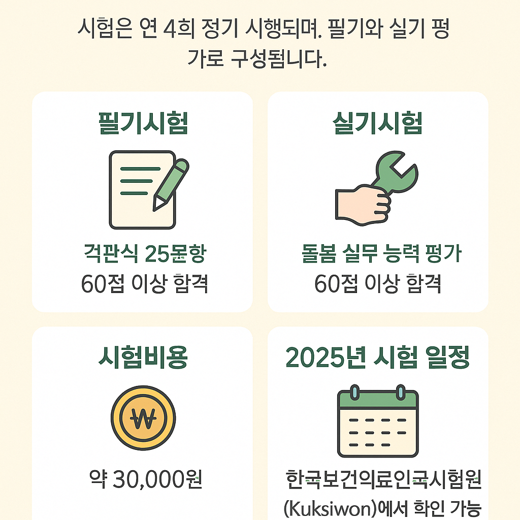 - 실기: 돌봄 실무 평가, 60점 이상 합격