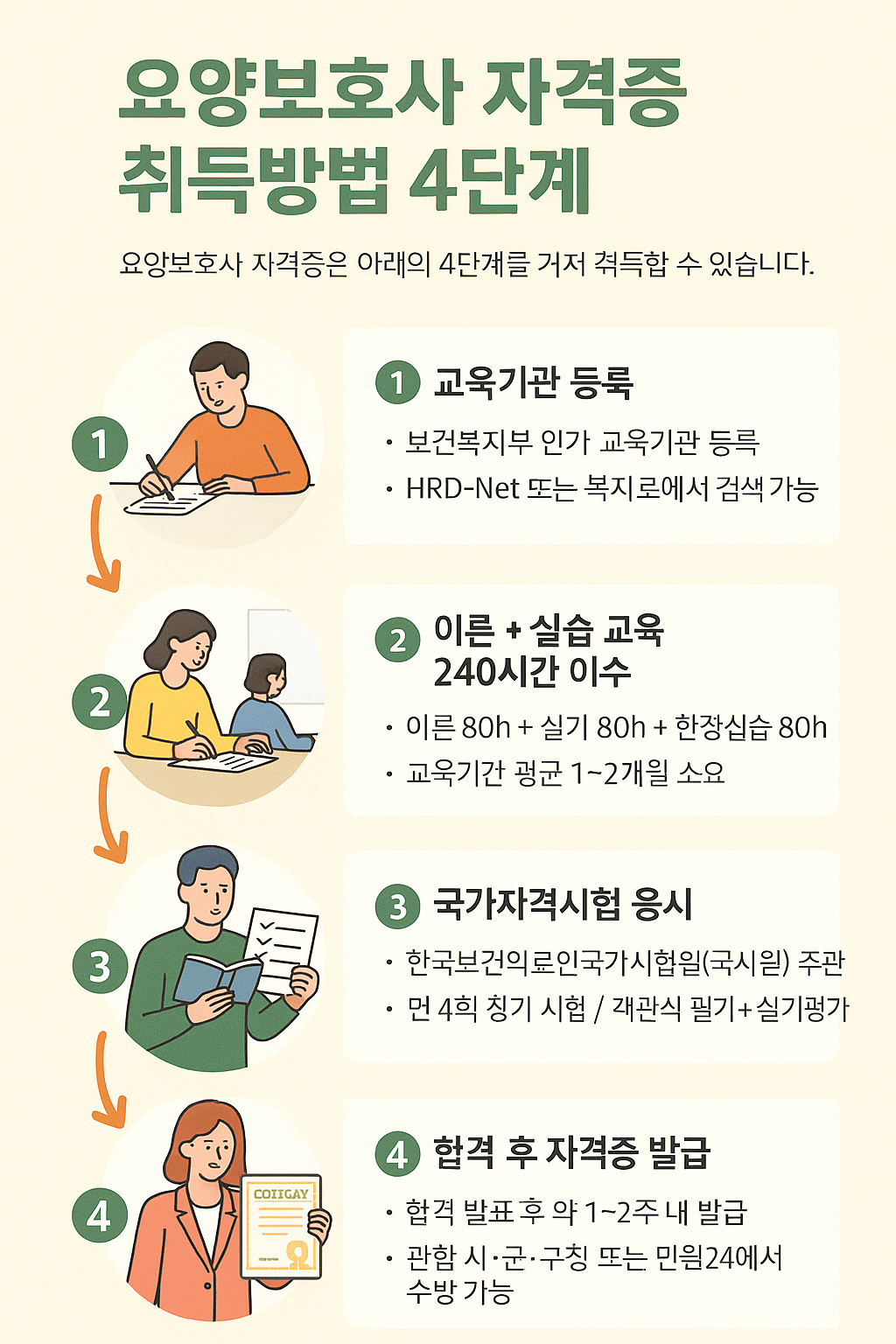 요양보호사 자격증은 보건복지부 인가 교육기관에서 240시간 교육 이수 후 국가시험에 합격하면 취득 가능.