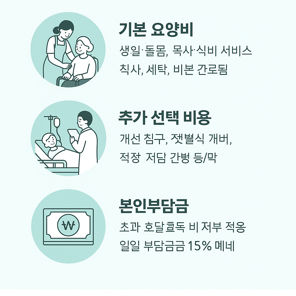 – 일부 고급형 요양원은 고급식 제공이나 문화 프로그램(원예치료, 미술치료 등) 참가비도 별도 부과될 수 있습니다.