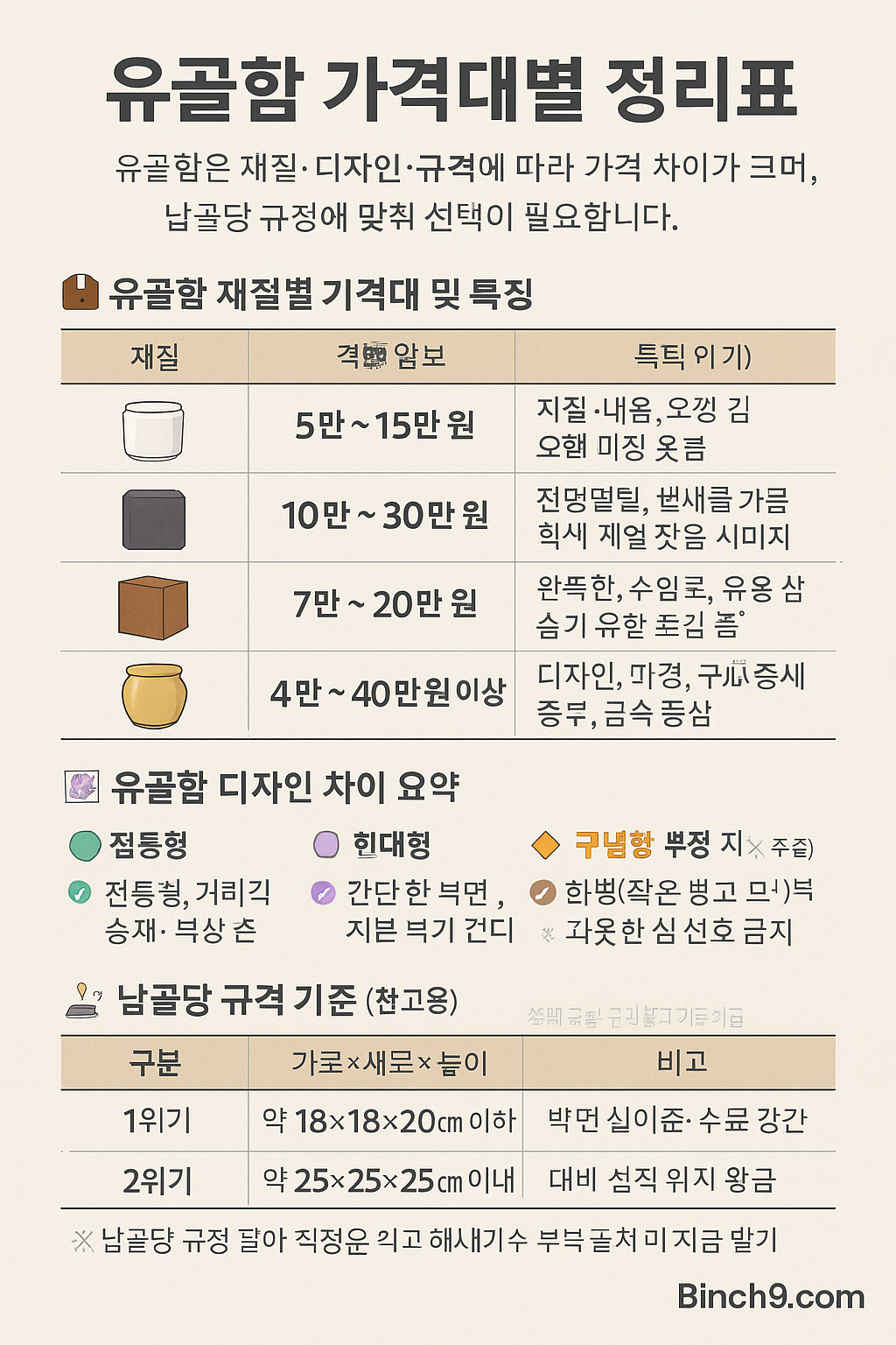 인포그래픽 제안 : ‘유골함 가격대별 정리표’ – 재질별 가격 / 디자인 차이 / 납골당 규격 비교표