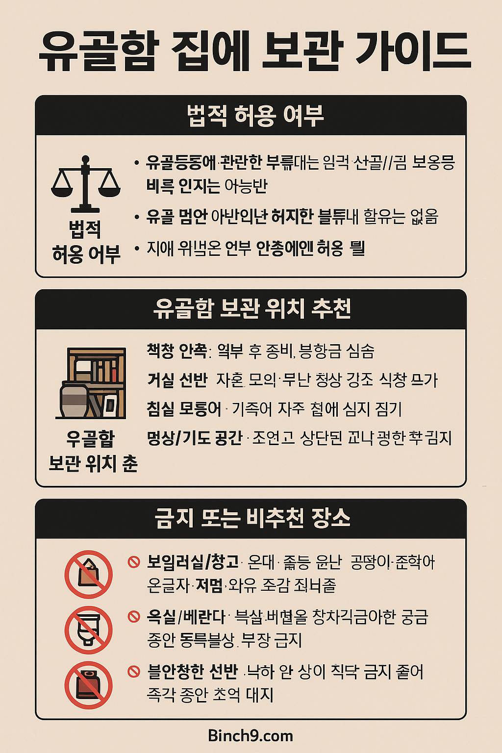 인포그래픽 제안 : ‘유골함 집에 보관 가이드’ – 법적 허용 여부 / 보관 위치 추천 / 금지 장소 요약