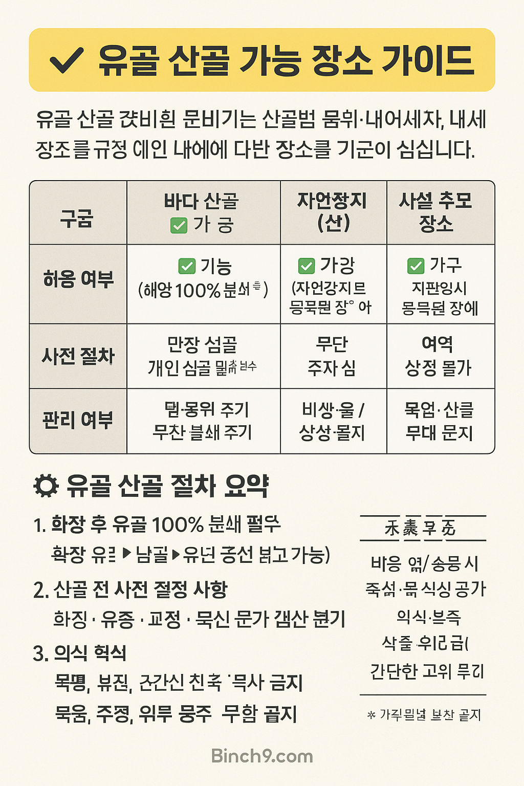 인포그래픽 제안 : ‘유골 산골 가능 장소 가이드’ – 바다 vs 산 vs 사설 장소 비교표 + 유골 분쇄·장소·절차 요약