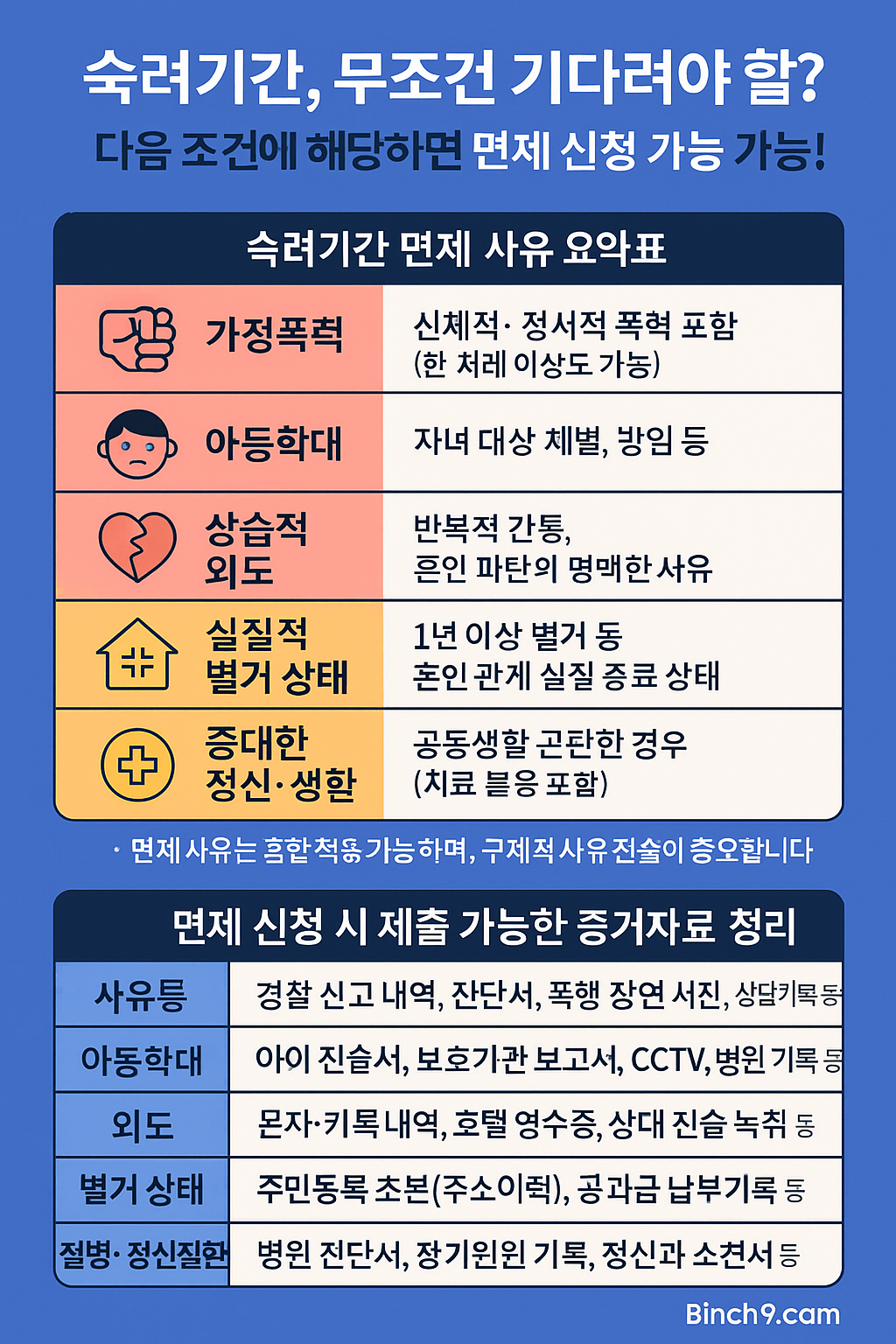 인포그래픽 제안 : ‘숙려기간 면제 요건과 증거 자료 정리표’ – 가정폭력 사유별, 준비서류 한눈에 보기