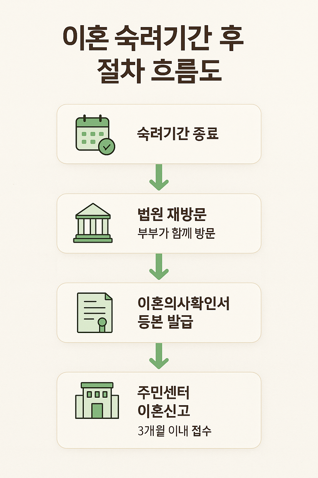 숙려기간 종료 후에는 다음과 같은 절차가 기다리고 있어요. 아래 순서를 꼭 기억해 주세요.