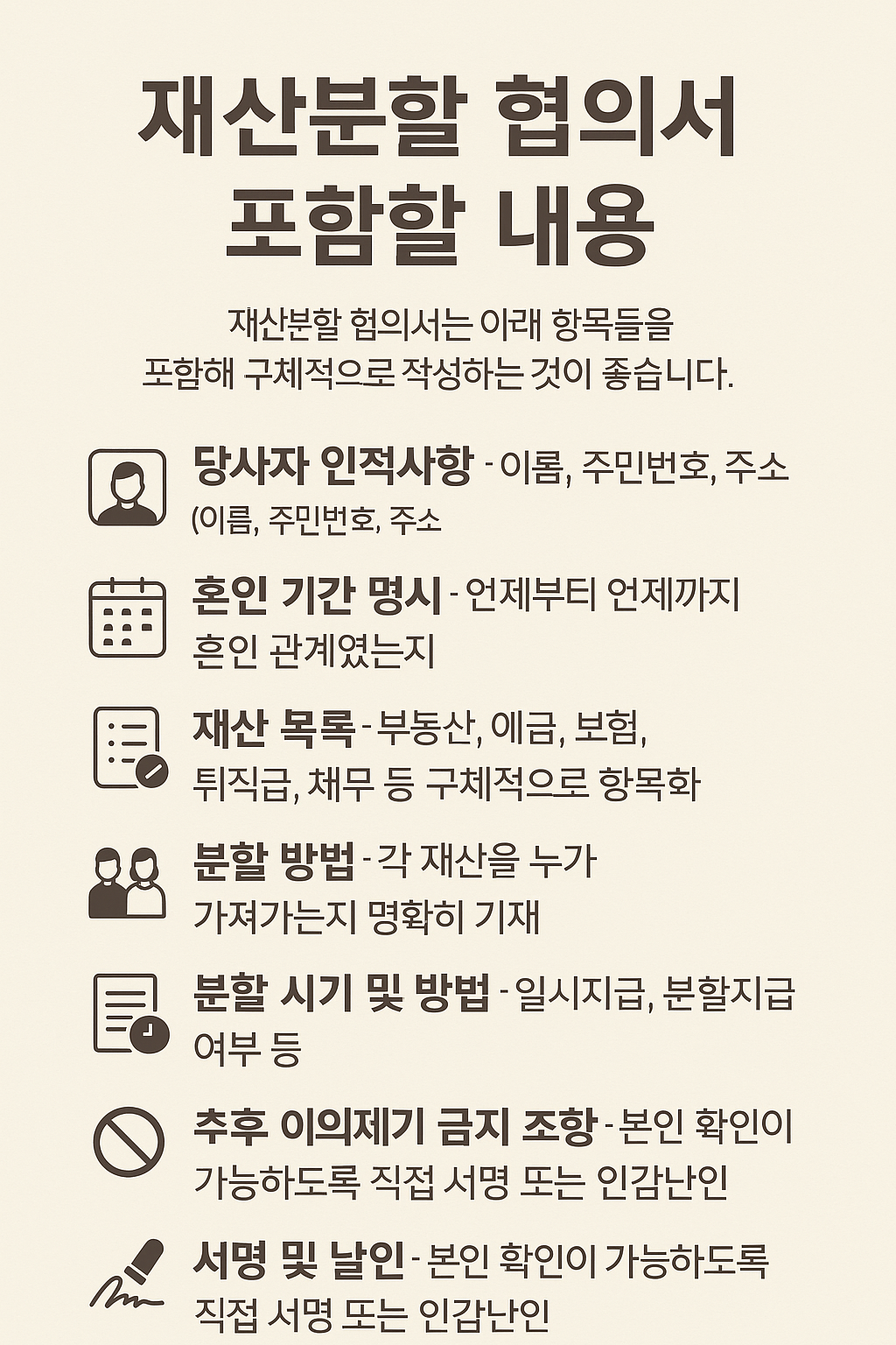 재산분할 협의서는 아래 항목들을 포함해 구체적으로 작성하는 것이 좋습니다.
