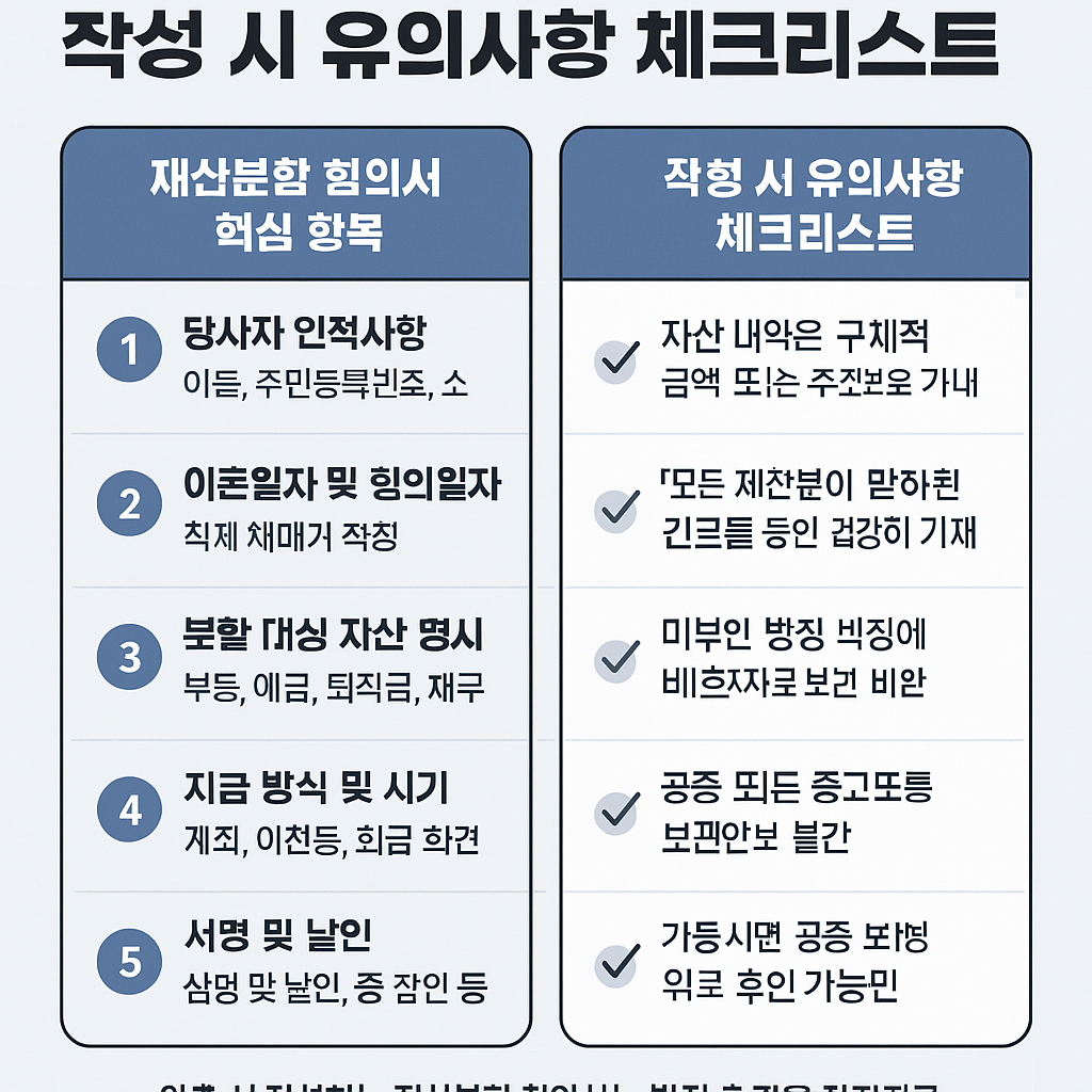 ☑ 재산 평가 기준일을 명확히 설정 (예: 이혼일 기준, 서명일 기준 등)