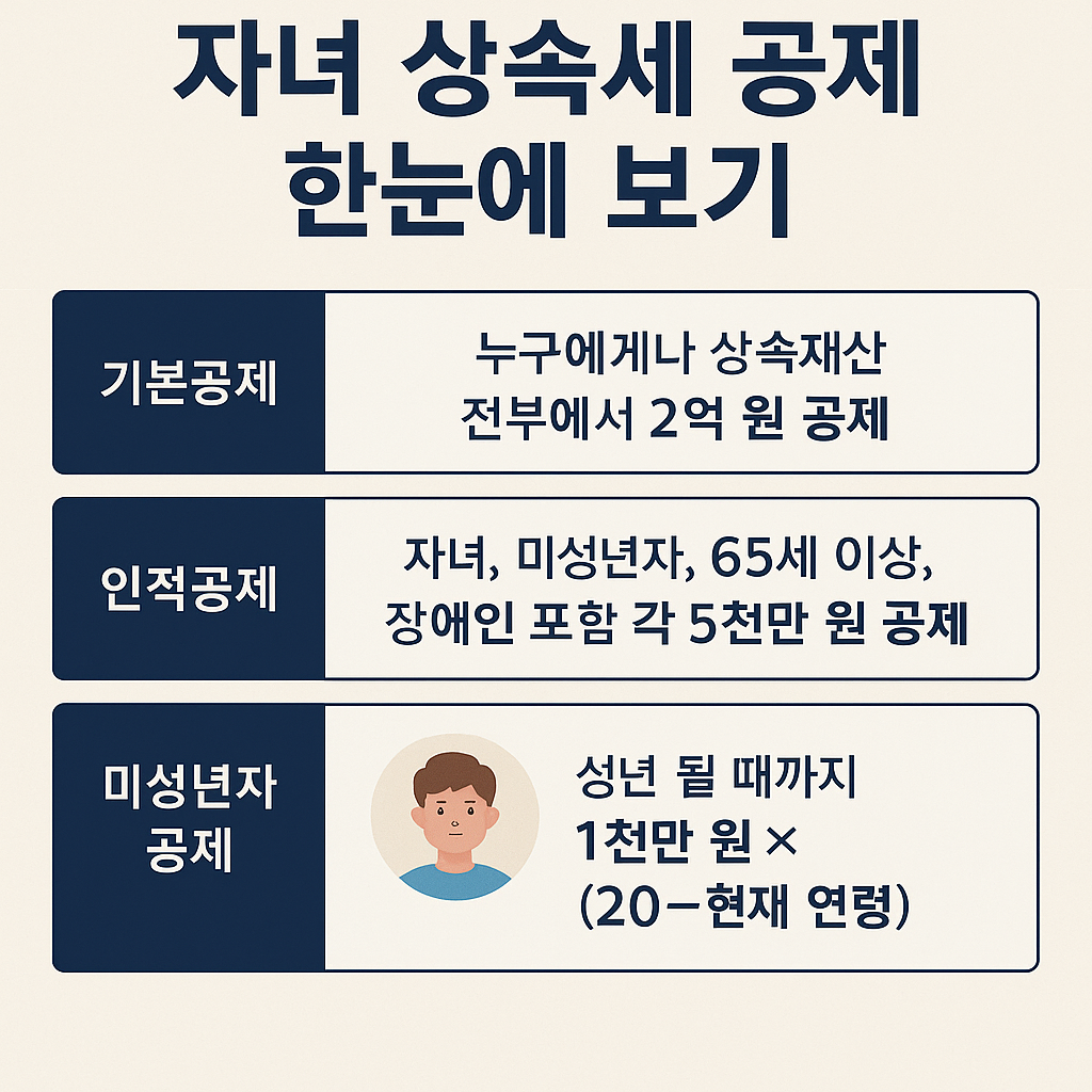 인포그래픽 제안 : ‘자녀 상속세 공제 항목 한눈에 보기’ – 기본공제 + 인적공제 + 미성년자 공제 요약표