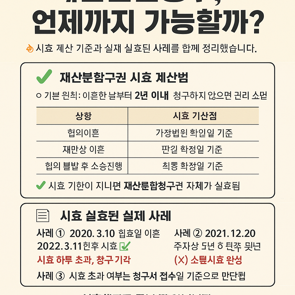 ❗주의: ‘2년 시효’는 이혼 신고일 또는 판결 확정일을 기준으로 엄격하게 적용되며, 중간에 연락을 주고받거나 구두로 합의해도 시효 연장은 인정되지 않습니다.