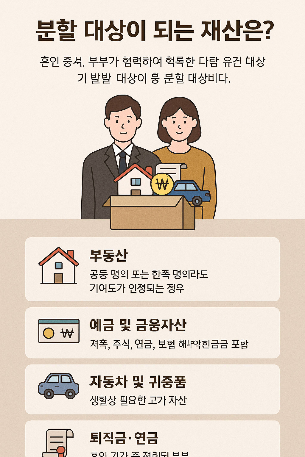 ※ 단, 개인 상속재산, 증여재산, 혼인 전 소유 재산은 원칙적으로 제외됩니다. 단, 혼인 기간 중 유지·관리·증식된 경우 일부 포함될 수 있음.