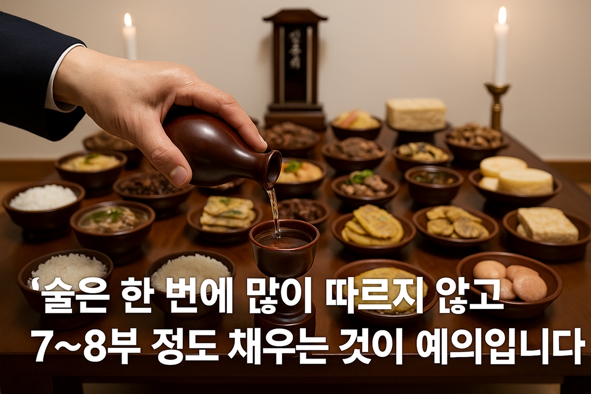 - 술은 한 번에 많이 따르지 않고 7~8부 정도 채우는 것이 예의입니다.