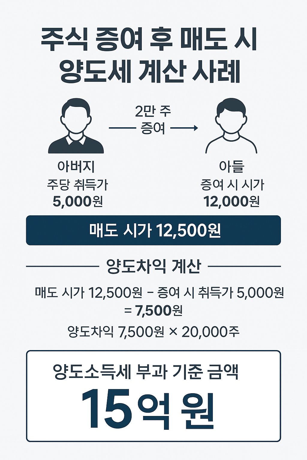 주가는 소폭 올라 12,500원에 매도했지만, 문제는 양도소득세 계산 기준이 아버지의 취득가인 5,000원이었다는 점이었죠.