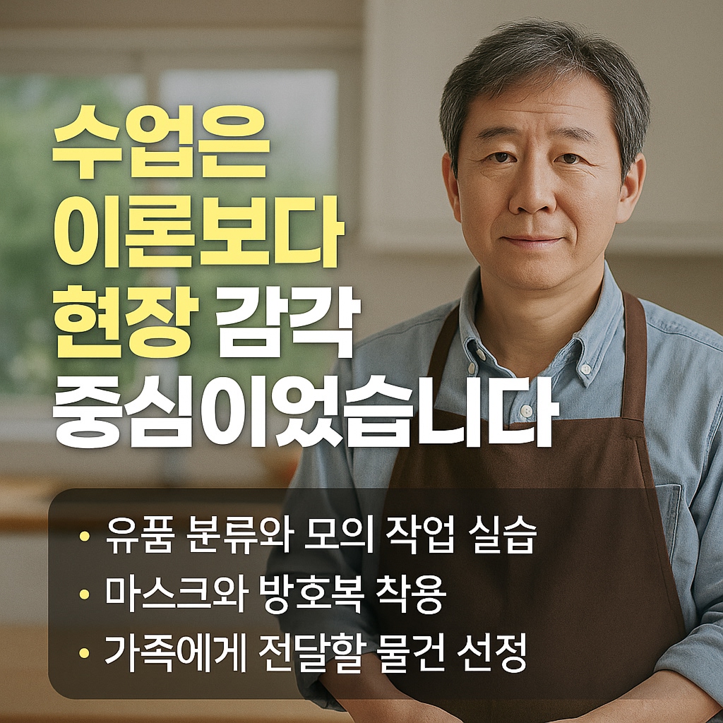 우리는 실제 유품정리 현장에서 사용하는 장갑, 마스크, 방호복, 집게, 분류 박스를 그대로 사용하면서 모의 정리 실습을 했습니다. 버릴 물건, 유족에게 돌려줄 물건, 기록이 필요한 물건들을 나눠가며 직접 정리하고, 작업 동선까지 체크해야 했죠.