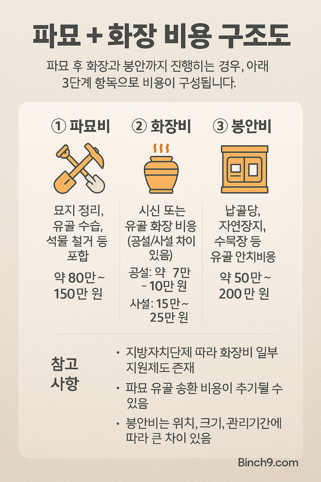 인포그래픽 제안 : ‘파묘+화장 비용 구조도’ – 파묘비 / 화장비 / 봉안비 항목별 요약 + 평균 비용대 정리